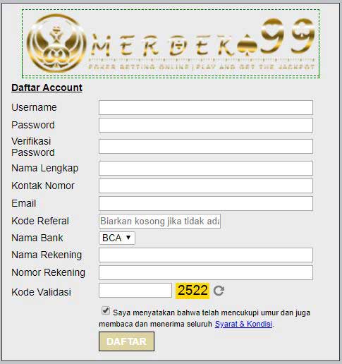 Setelah Anda memenuhi persyaratan di atas, silahkan akses Website Poker QQ dan BandarQ Online Terpercaya Merdeka99 lalu klik tombol “Daftar Sekarang”. Nantinya Anda akan melihat tampilan Form Pendaftaran Merdeka99 sebagai berikut :